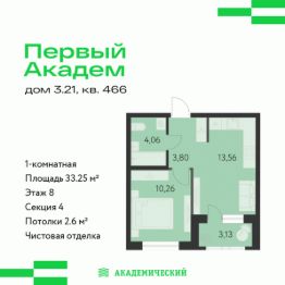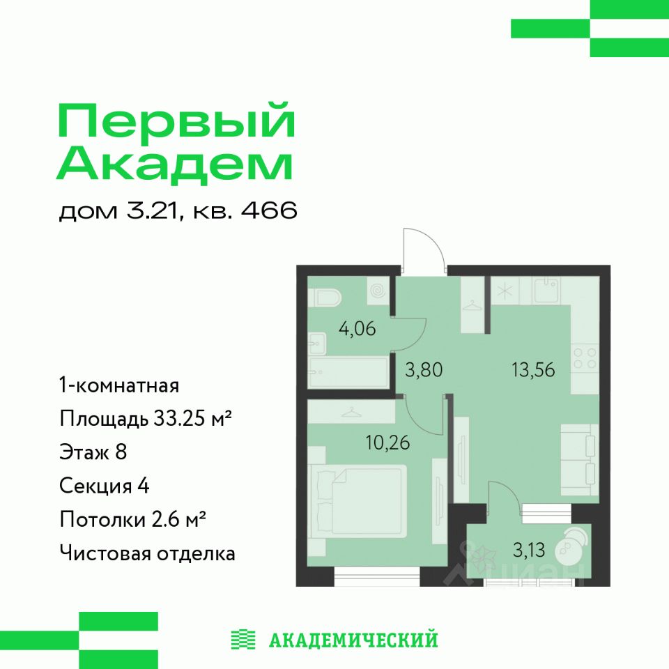 Продается 1-комнатная квартира площадью 33.25 кв.м. от девелопера "Академический" в жилом квартале "Первый Академ". Срок сдачи дома в 2028 году. Выгоды и скидка напрямую от застройщика.