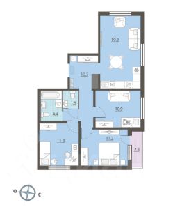 Жилая площадь 33.4 м2, кухня 19.2 м2, отделка под ключ. Раздельных санузлов - нет, балконов - нет, лоджий - 1.