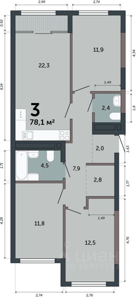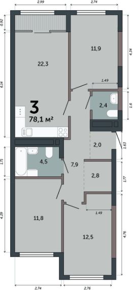 Продаётся 3-комнатная квартира в строящемся доме (Дом 2 этап 3), срок сдачи: I-кв. 2027, общей площадью 78.1 кв.м., на 3 этаже. "Парк Победы" состоит из трёх многосекционных домов переменной этажности, подземного паркинга и коммерческих помещений. Секции домов образуют закрытые дворы, которые объединены арками.