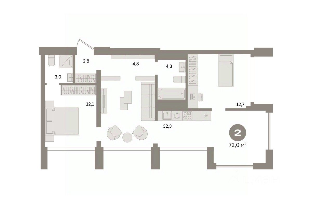 Квартира с кухней-гостиной и двумя спальнями в Южных кварталах. Особенности планировки: предчистовая отделка, мастер-спальня.