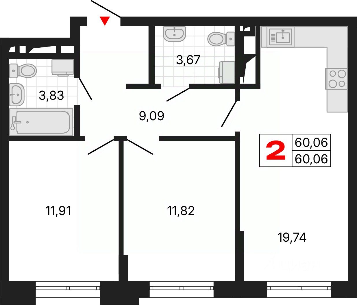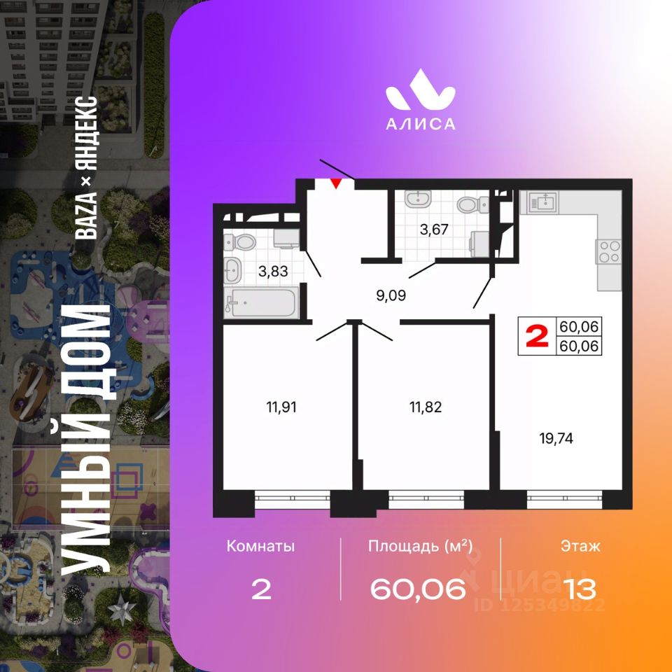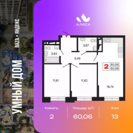 Просторная двухкомнатная квартира с предчистовой отделкой в ЖК "Алиса" на 13 этаже. Общая площадь: 60.06 кв.м., жилая: 23.73 кв.м., площадь просторной кухни-столовой: 19.74 кв.м. Комнаты изолированные, все окна выходят на одну сторону. В квартире один совмещенный и один раздельный санузел. Высота потолков 2.72 м.