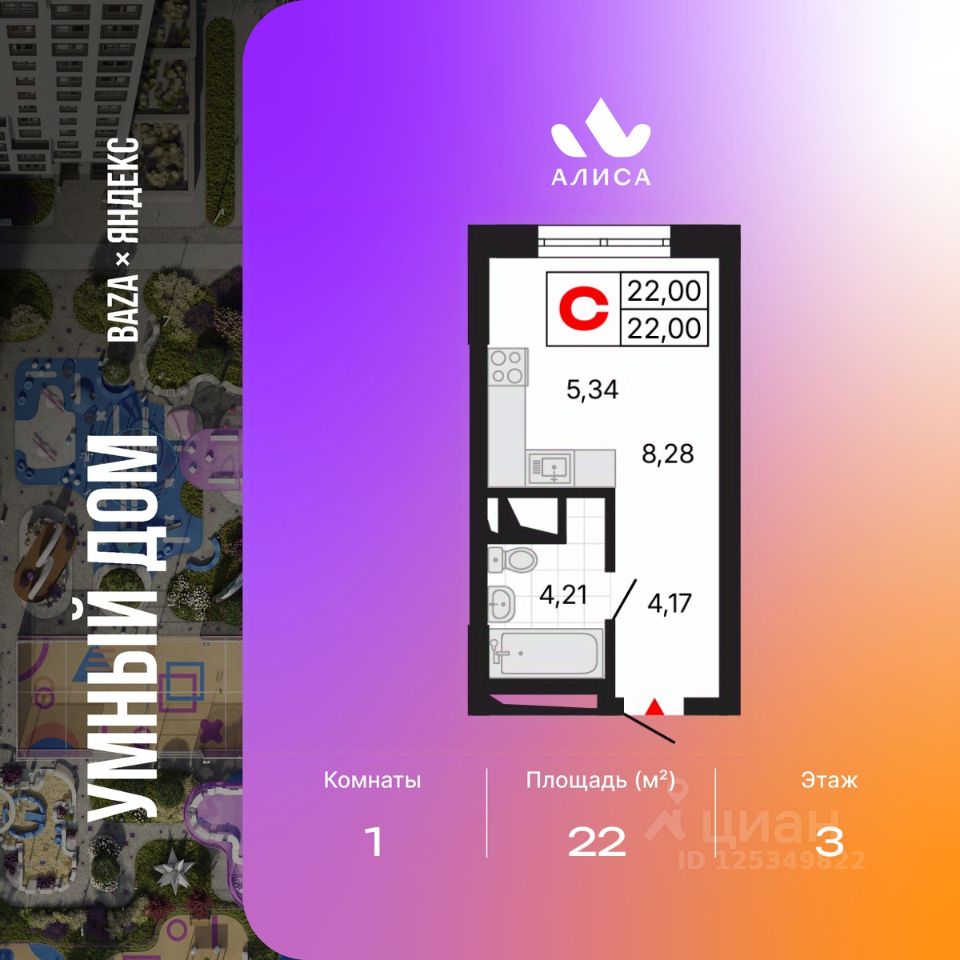 Продается 1-комн. квартира-студия с предчистовой отделкой в ЖК "Алиса" на 3 этаже. Общая площадь: 22 кв.м., площадь гостиной 13.62 кв.м., из которых 5.34 кв.м. выделено под кухонную зону. Все окна выходят на одну сторону. В квартире один совмещенный санузел. Высота потолков 2.72 м.