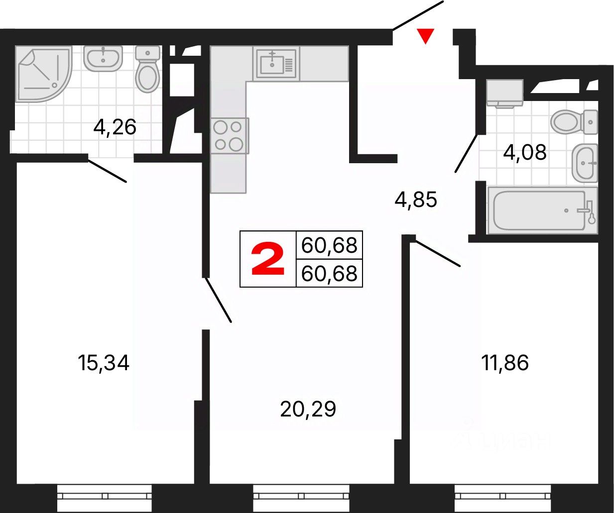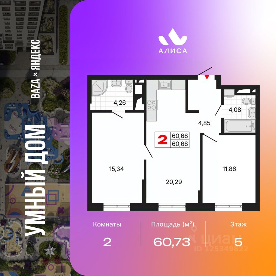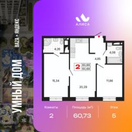 Продается 2-комн. квартира с предчистовой отделкой в ЖК "Алиса" на 5 этаже. Общая площадь: 60.73 кв.м., жилая: 27.2 кв.м., площадь просторной кухни-столовой: 20.17 кв.м. Комнаты изолированные, все окна выходят на одну сторону. В квартире два совмещенных санузла. Высота потолков 2.72 м.