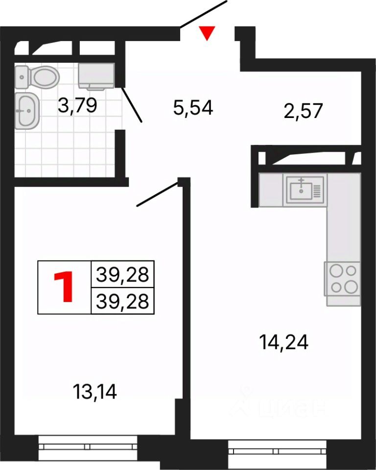 1-комн. квартира с предчистовой отделкой в ЖК "Алиса" на 15 этаже. Общая площадь: 39.28 кв.м., жилая: 13.14 кв.м., площадь просторной кухни-столовой: 14.24 кв.м. Все окна выходят на одну сторону. В квартире один совмещенный санузел. Высота потолков 2.72 м.
