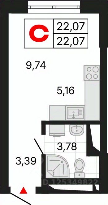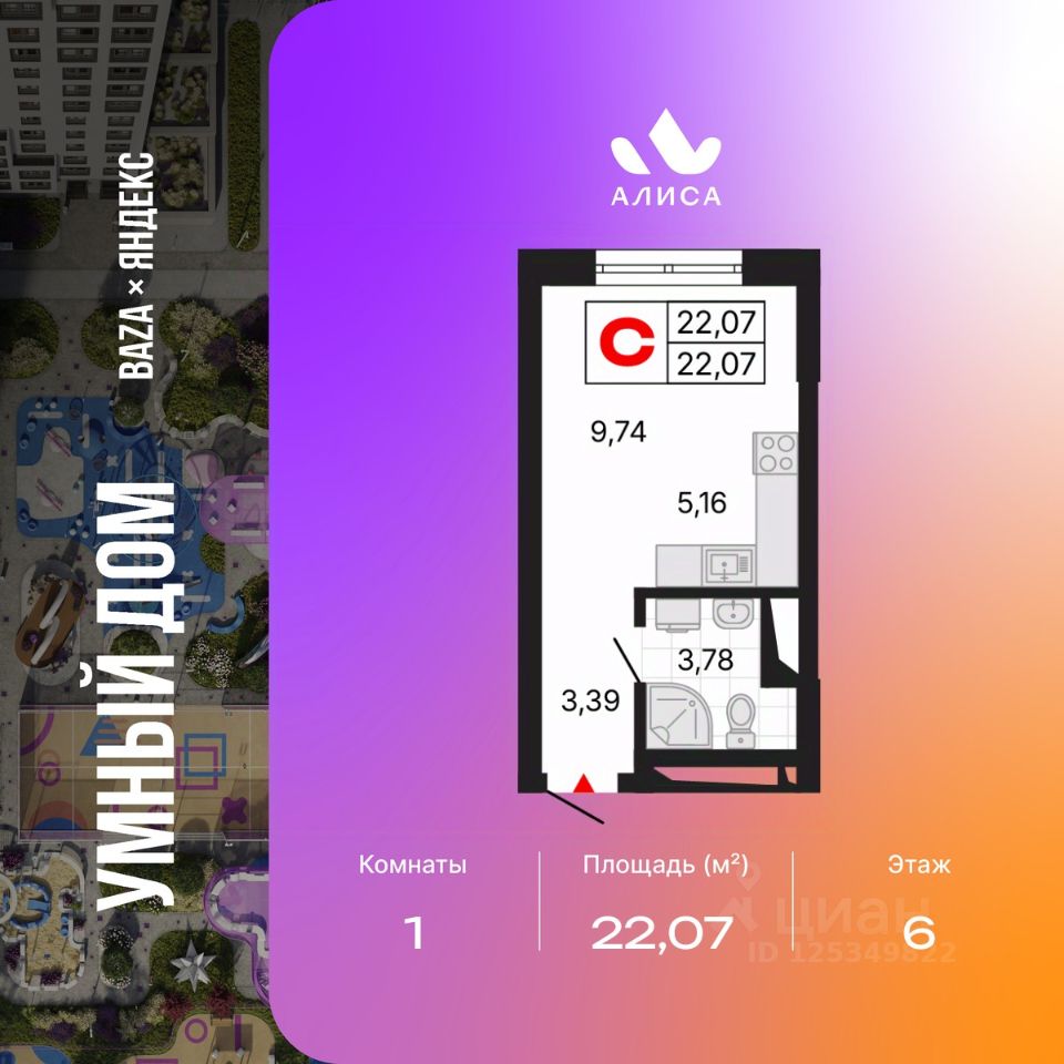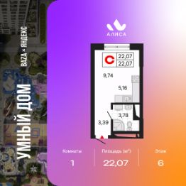 Продается однокомнатная квартира-студия с предчистовой отделкой в ЖК "Алиса" на 6 этаже. Общая площадь: 22.07 кв.м., площадь гостиной 14.92 кв.м., из которых 5.18 кв.м. выделено под кухонную зону. Все окна выходят на одну сторону. В квартире один совмещенный и один раздельный санузел. Высота потолков 2.72 м.