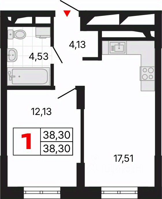 1-комн. квартира с предчистовой отделкой в ЖК "Алиса" на 14 этаже. Общая площадь: 38.36 кв.м., жилая: 12.13 кв.м., площадь просторной кухни-столовой: 17.55 кв.м. Все окна выходят на одну сторону. В квартире один совмещенный и один раздельный санузел. Высота потолков 2.72 м.