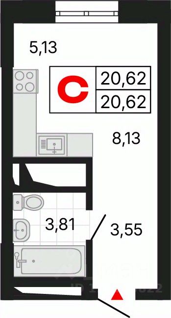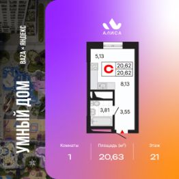 Продается 1-комн. квартира-студия с предчистовой отделкой в ЖК "Алиса" на 21 этаже. Общая площадь: 20.63 кв.м., площадь гостиной 13.29 кв.м., из которых 5.16 кв.м. выделено под кухонную зону. Все окна выходят на одну сторону. В квартире один совмещенный и один раздельный санузел. Высота потолков 2.72 м.
