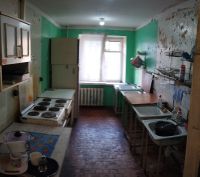 Окна у комнаты выходят во двор, не на проезжую часть.Общая дверь в блоке на 5 комнат, живут в основном заводчане, в соседнем крыле военные, лицеисты, кто работает на складах. Сан узел раздельный. Есть общая кухня.