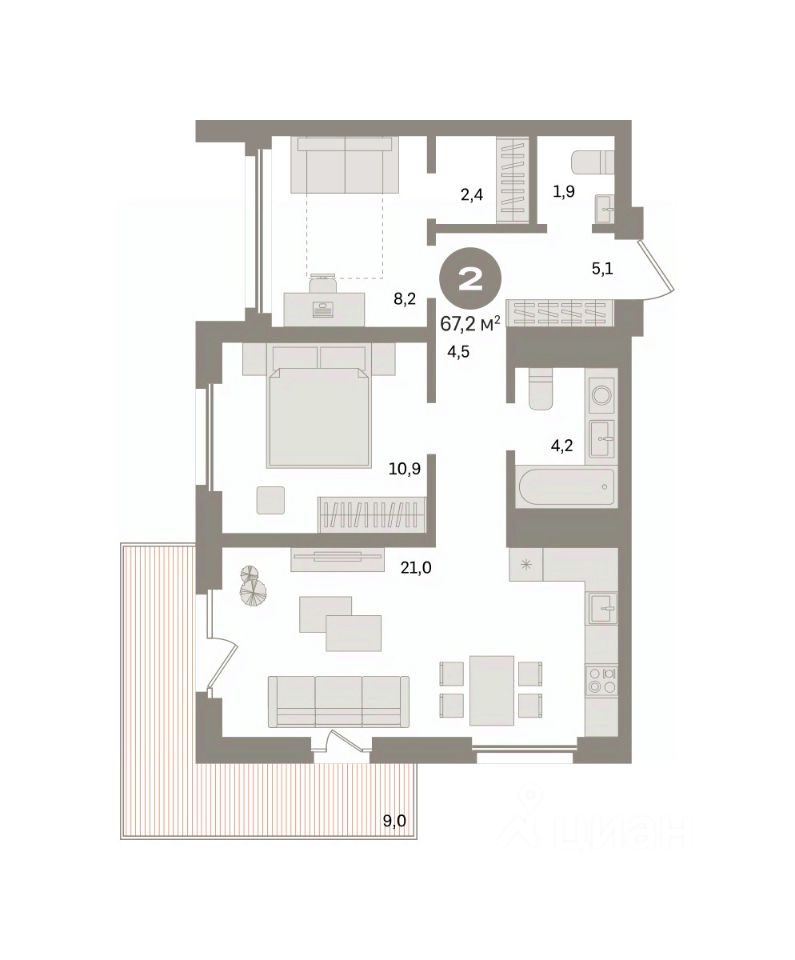Квартира с кухней-гостиной и двумя спальнями в Южных кварталах. Особенности планировки: второй санузел, гардеробная, вид во двор, предчистовая отделка, балкон.