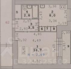 Планировка квартиры: комната 16,7 м.кв., кухня 8 м.кв., гардеробная, совмещенный санузел и лоджия.