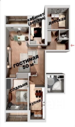В квартире 3 изолированные комнаты и огромный зал 50 кв.м. со столовой зоной и выходом на лоджию. Детская, кабинет (или вторая детская) и туалет расположены по одну сторону от гостиной, достаточно большая родительская спальня 17 кв.м. с выходом на вторую лоджию, кухня и ванная - по другую.