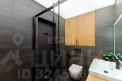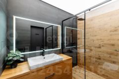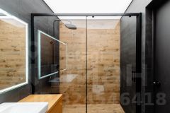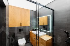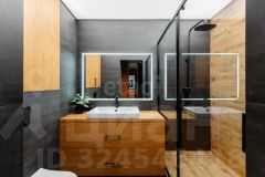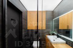 Санузел совмещенный: световой потолок (весь потолок — это свет) с регулируемой яркостью и температурой. Душевая зона, инсталляция, шкаф и комод из дуба и шпонированного МДФ .
