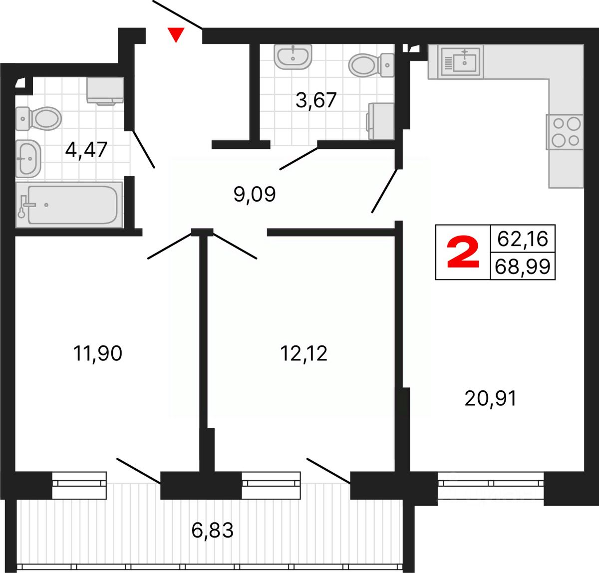 Двухкомнатная квартира с предчистовой отделкой в ЖК "Алиса" на 2 этаже. Общая площадь: 68.99 кв.м., жилая: 24.02 кв.м., площадь просторной кухни-столовой: 20.91 кв.м. Комнаты изолированные, все окна выходят на одну сторону. В квартире один балкон, один совмещенный и один раздельный санузел. Наличие террасы в квартире открывает возможность для создания зон отдыха в кругу семьи и друзей. Высота потолков 2.72 м.