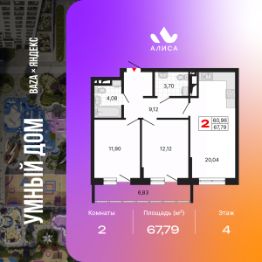 Продается 2-комн. квартира от застройщика с предчистовой отделкой в ЖК "Алиса" на 4 этаже. Общая площадь: 67.79 кв.м., жилая: 24.02 кв.м., площадь просторной кухни-столовой: 20.04 кв.м. Комнаты изолированные, все окна выходят на одну сторону. В квартире один балкон, один совмещенный и один раздельный санузел. Терраса представляет собой роскошную зону отдыха, где вы на свой вкус можете создать атмосферу комфорта и уюта. Высота потолков 2.72 м.