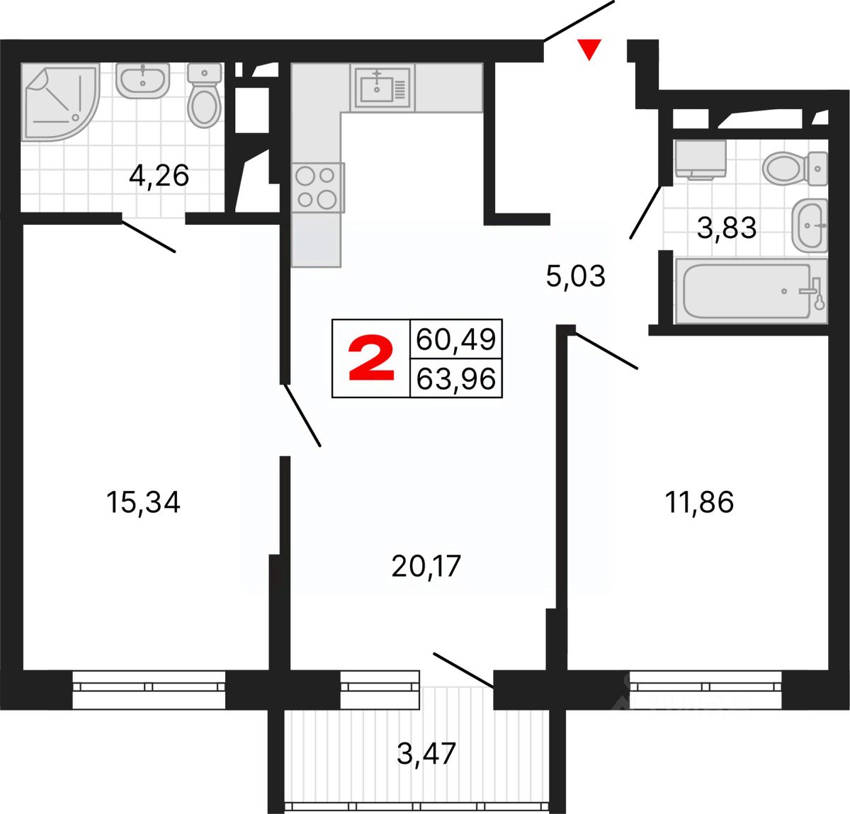 2-комн. квартира от застройщика с предчистовой отделкой в ЖК "Алиса" на 9 этаже. Общая площадь: 63.96 кв.м., жилая: 27.2 кв.м., площадь просторной кухни-столовой: 20.17 кв.м. Комнаты изолированные, все окна выходят на одну сторону. В квартире один балкон, два совмещенных и два раздельных санузла. Высота потолков 2.72 м.