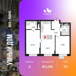 Продается 2-комн. квартира с предчистовой отделкой в ЖК "Алиса" на 10 этаже. Общая площадь: 60.48 кв.м., жилая: 27.2 кв.м., площадь просторной кухни-столовой: 20.17 кв.м. Комнаты изолированные, все окна выходят на одну сторону. В квартире два совмещенных и два раздельных санузла. Высота потолков 2.72 м.