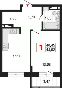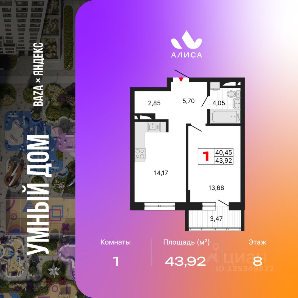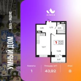 1-комн. квартира от застройщика с предчистовой отделкой в ЖК "Алиса" на 8 этаже. Общая площадь: 43.92 кв.м., жилая: 13.68 кв.м., площадь просторной кухни-столовой: 14.17 кв.м. Все окна выходят на одну сторону. В квартире один балкон, один совмещенный и один раздельный санузел. Высота потолков 2.72 м.