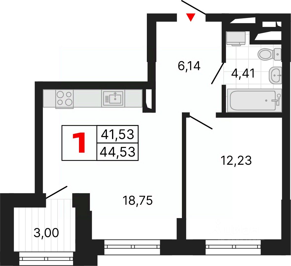 Однокомнатная квартира с предчистовой отделкой в ЖК "Алиса" на 3 этаже. Общая площадь: 44.53 кв.м., жилая: 12.23 кв.м., площадь просторной кухни-столовой: 18.75 кв.м. Все окна выходят на одну сторону. В квартире одна лоджия, один совмещенный и один раздельный санузел. Высота потолков 2.72 м.