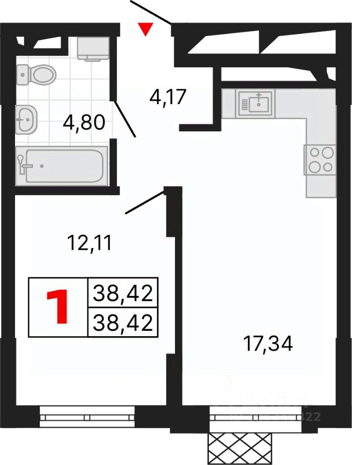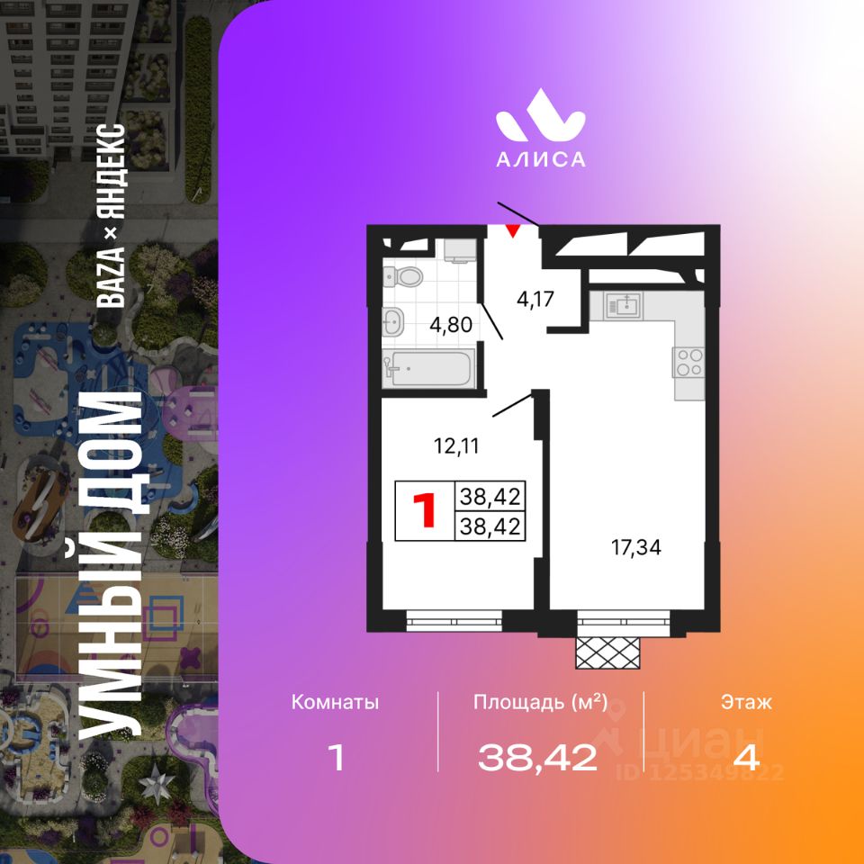 Продается 1-комн. квартира с предчистовой отделкой в ЖК "Алиса" на 4 этаже. Общая площадь: 38.42 кв.м., жилая: 12.11 кв.м., площадь просторной кухни-столовой: 17.34 кв.м. Все окна выходят на одну сторону. В квартире один совмещенный и один раздельный санузел. Высота потолков 2.72 м.