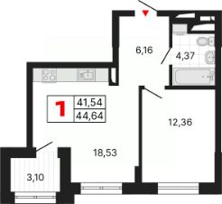 Просторная 1-комн. квартира с предчистовой отделкой в ЖК "Алиса" на 9 этаже. Общая площадь: 44.64 кв.м., жилая: 12.36 кв.м., площадь просторной кухни-столовой: 18.65 кв.м. Все окна выходят на одну сторону. В квартире одна лоджия, один совмещенный и один раздельный санузел. Высота потолков 2.72 м.