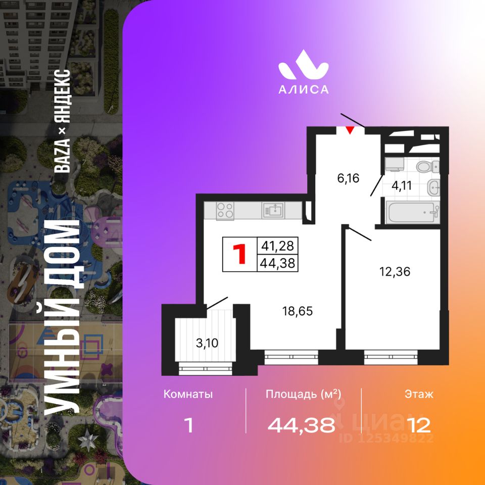 Однокомнатная квартира от застройщика с предчистовой отделкой в ЖК "Алиса" на 12 этаже. Общая площадь: 44.38 кв.м., жилая: 12.36 кв.м., площадь просторной кухни-столовой: 18.65 кв.м. Все окна выходят на одну сторону. В квартире одна лоджия, один совмещенный и один раздельный санузел. Высота потолков 2.72 м.