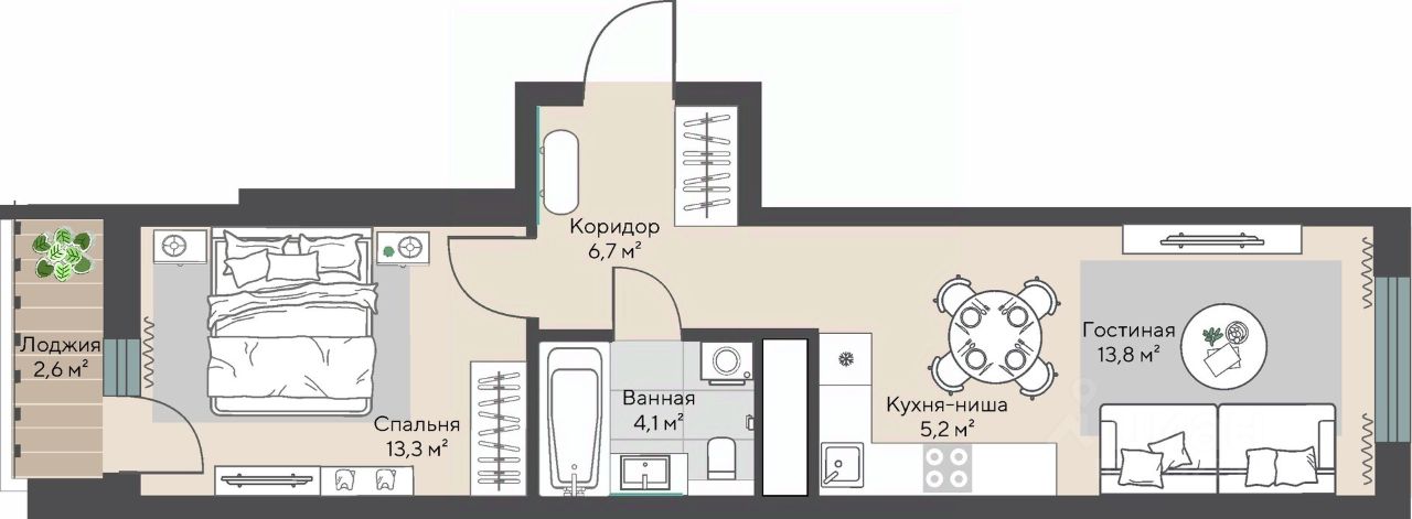 Продаётся 2-комнатная квартира в строящемся доме (Дом 13), срок сдачи: IV-кв. 2025, общей площадью 44.4 кв.м., на 5 этаже.