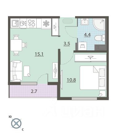 Жилая площадь 11 м2, кухня 15.3 м2, чистовая отделка. Раздельных санузлов - нет, балконов - нет, лоджий - 1.