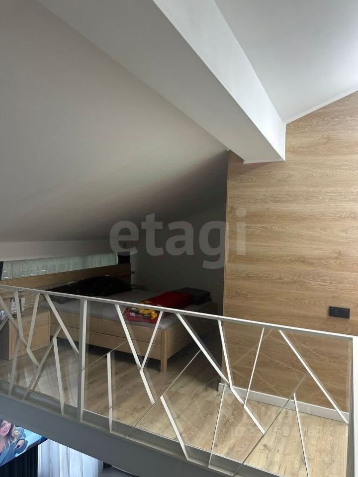 На первом этаже размещена объединенная кухня-гостиная, два встроенных шкафа-купе и санузел с душевой кабиной и ванной. Второй уровень отведен под изолированную спальню, гардеробную и второй санузел.