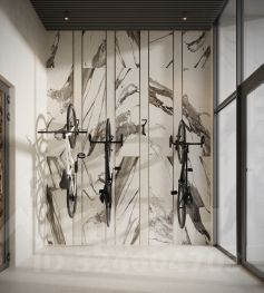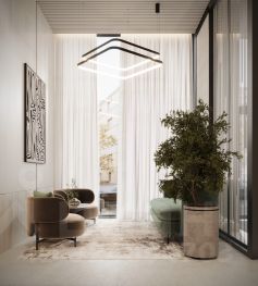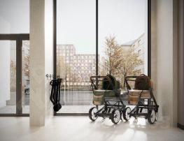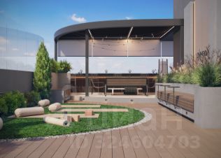 Внутренний двор атмосферное пространство со строгими очертаниями и лаконичными формами. Пространство зонировано: фонтан, зона для пикника, амфитеатр, лаунж-зона с гамаками и лежаками, детские площадки для всех возрастов, пространства с навесами для родителей, зона воркаут со столом для настольного тенниса, велопарковка. Тихие уголки отделены от территории для активностей зелеными ширмами. Жители дополнительно смогут отдохнуть на общей открытой террасе на высоте