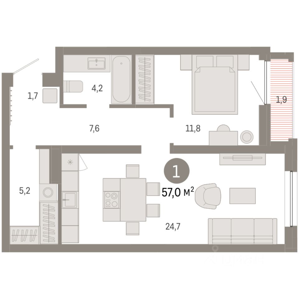 Квартира с кухней-гостиной и одной спальней в Южных кварталах. Особенности планировки: гардеробная, лоджия, предчистовая отделка.