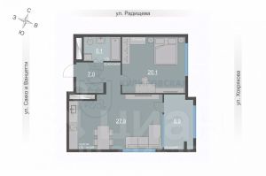 Двухкомнатное пространство, 60,1 м², с теплой лоджией 8,9 м2, которую можно без проблем объединить и увеличить площадь квартиры до 69 м2.
