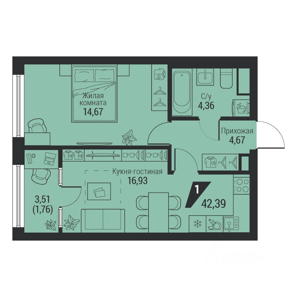 Общая площадь42,39 м²
