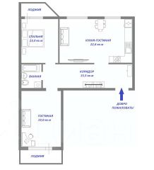 * Кухня-гостиная 23,5 кв.м.; две спальни 19 кв.м. и 13 кв.м. с выходом на панорамные лоджии; совмещенный санузел; прихожая.