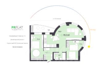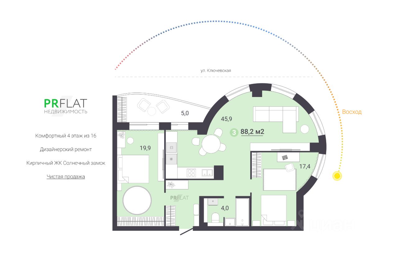 Общая площадь - 88,2 м2: холл и просторная кухня-гостиная со столовой зоной - 45,9 м2, две спальни - 17,4 м2 и 19,9 м2, совмещенный санузел, просторная лоджия 9 м2 с местами для хранения. Окна - в сторону улицы Ключевской.