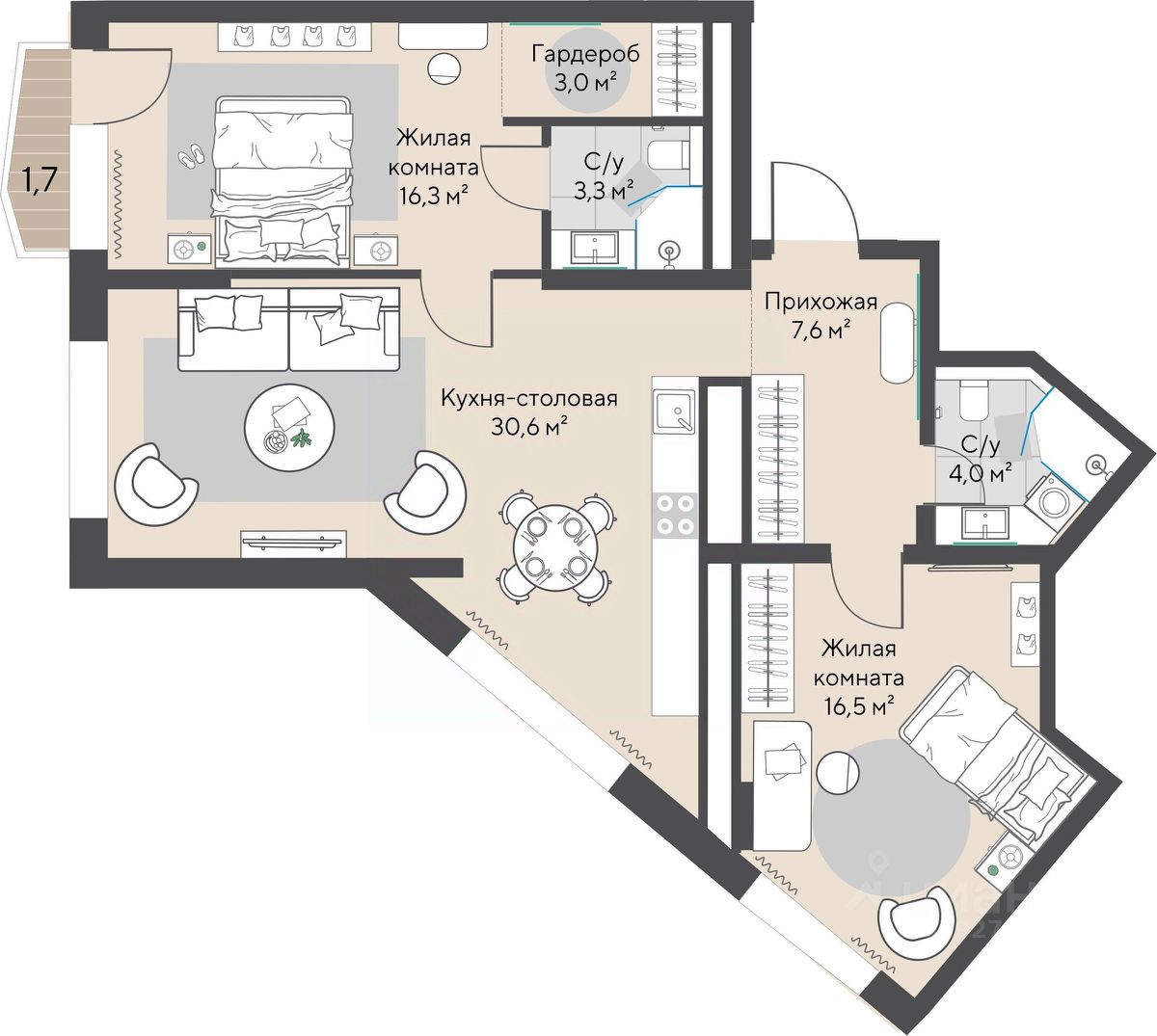 Продаётся 2-комнатная квартира в строящемся доме (Секции 2.3-2.4), срок сдачи: I-кв. 2028, общей площадью 84.1 кв.м., на 19 этаже.