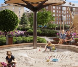 Двор без машин. Игровые площадки для детей разных возрастов, места отдыха и занятий спортом для взрослых не соседствуют с парковкой.