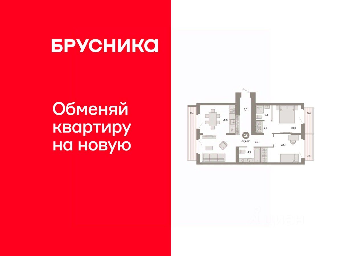 Квартира с кухней-гостиной и двумя спальнями в квартале "Депо". Особенности планировки: балкон, окна на две стороны, предчистовая отделка, разнесённые спальни.