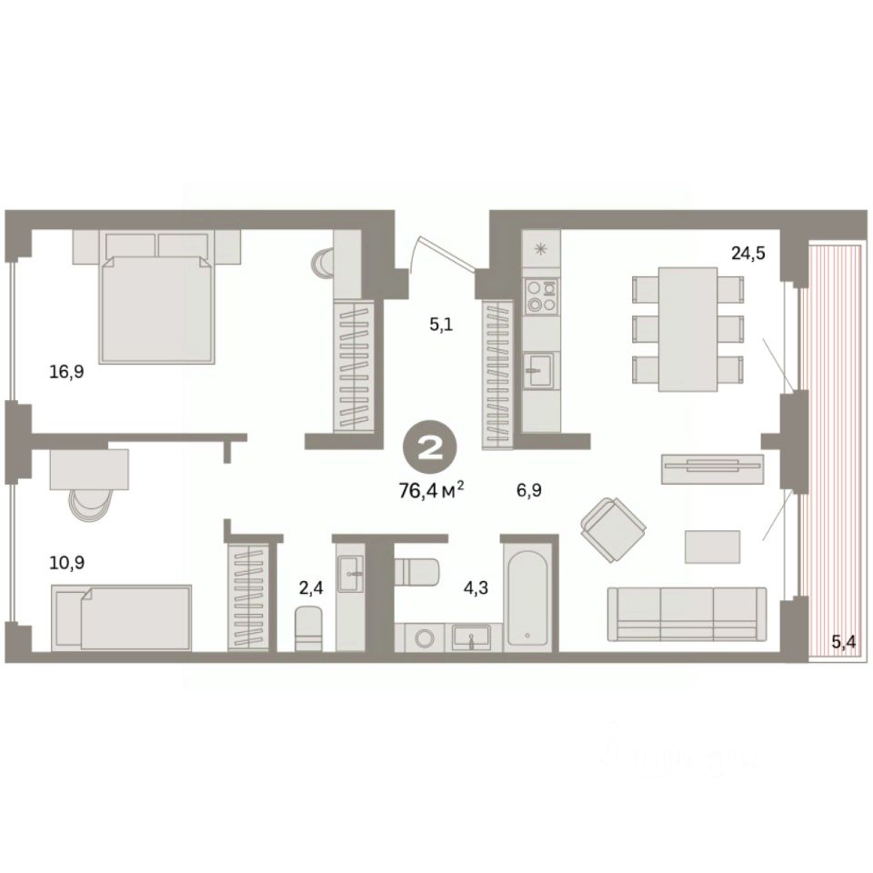 Квартира с кухней-гостиной и двумя спальнями в квартале "Депо". Особенности планировки: окна на две стороны, второй санузел, вид во двор, предчистовая отделка, терраса на крыше.