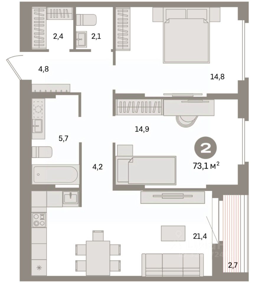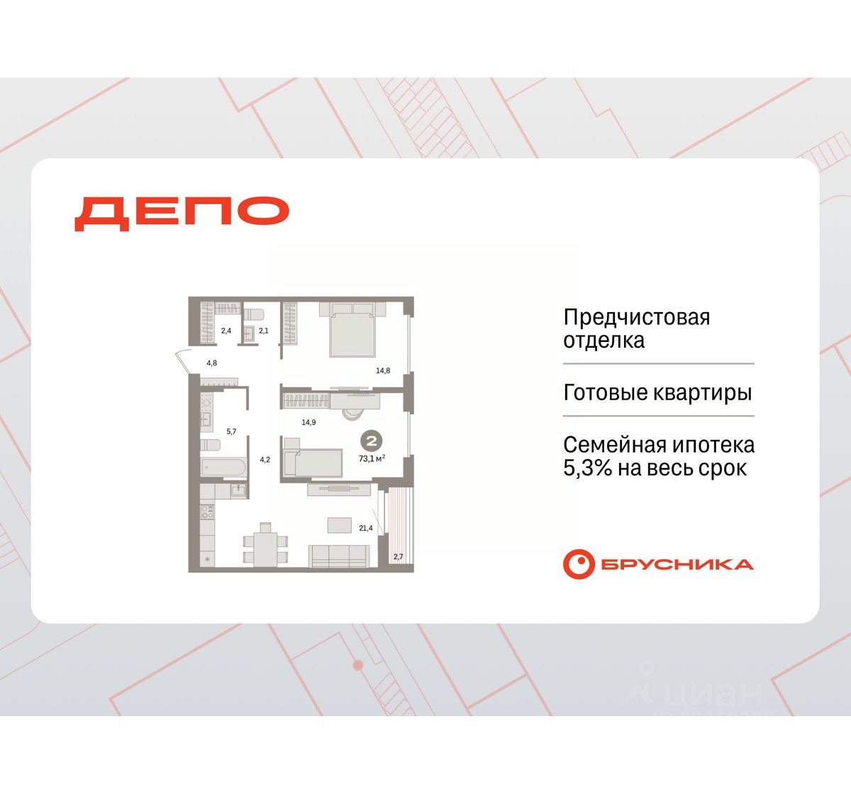 Квартира с кухней-гостиной и двумя спальнями в квартале "Депо". Особенности планировки: второй санузел, гардеробная, вид во двор, лоджия, предчистовая отделка.