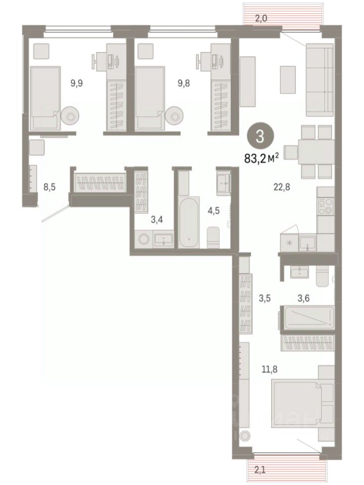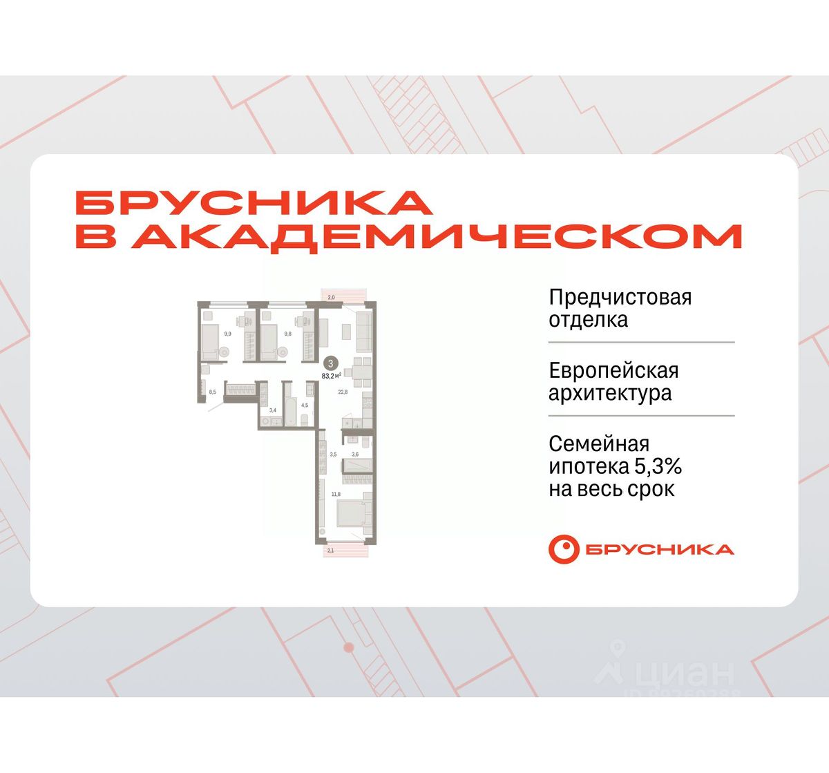 Квартира с кухней-гостиной и тремя спальнями в Бруснике в Академическом. Особенности планировки: второй санузел, гардеробная, вид во двор, разнесённые спальни, предчистовая отделка, мастер-спальня, постирочная, балкон.