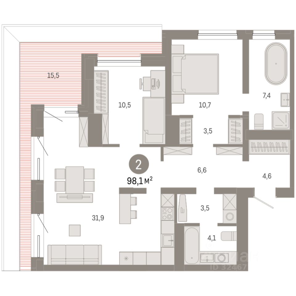 Квартира с кухней-гостиной и двумя спальнями в Северном квартале. Особенности планировки: гардеробная, окно в санузле, вид во двор, предчистовая отделка, мастер-спальня, постирочная, терраса на крыше.