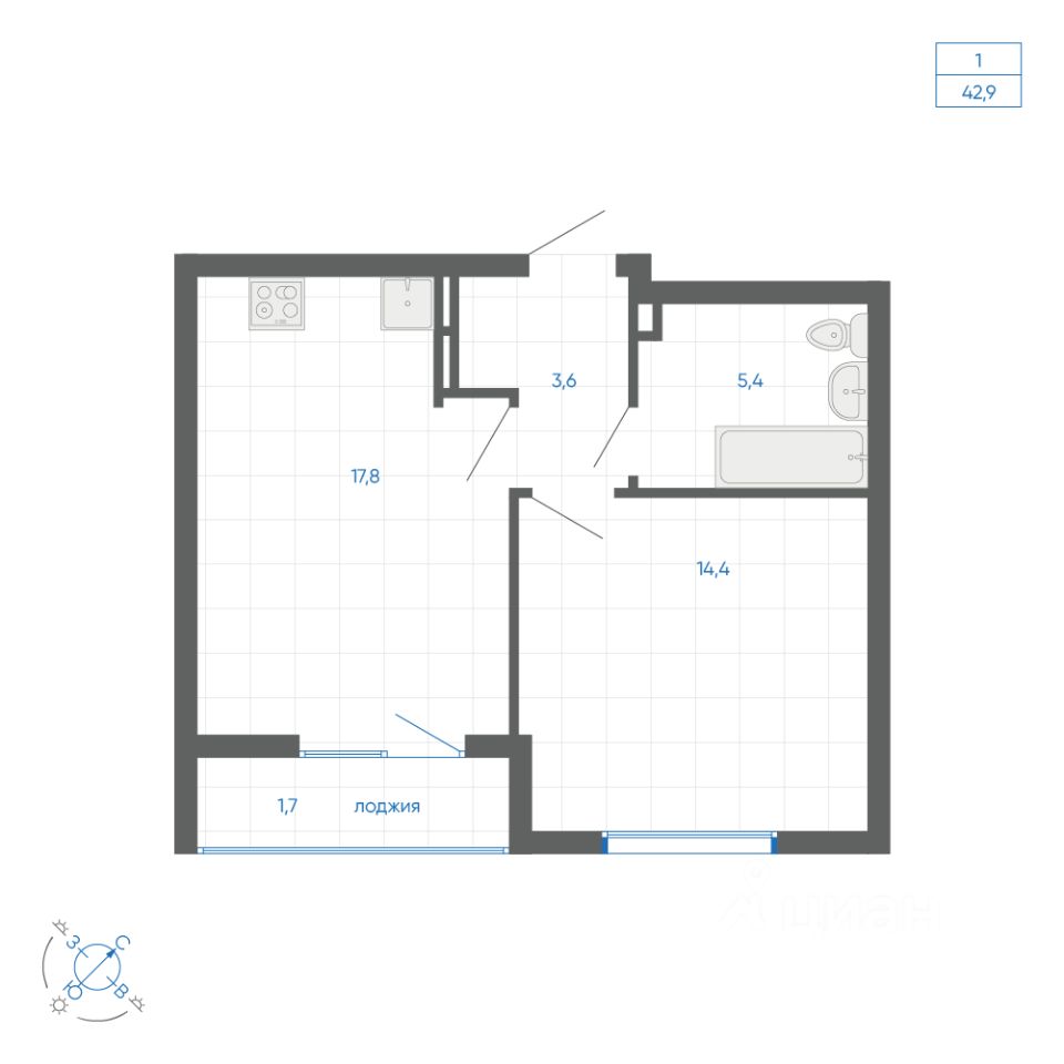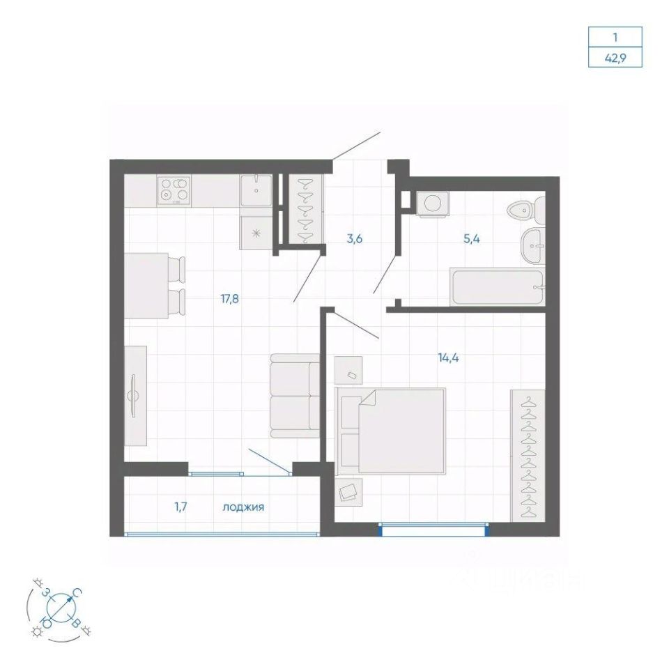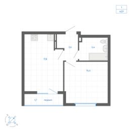 Общая площадь42,9 м²