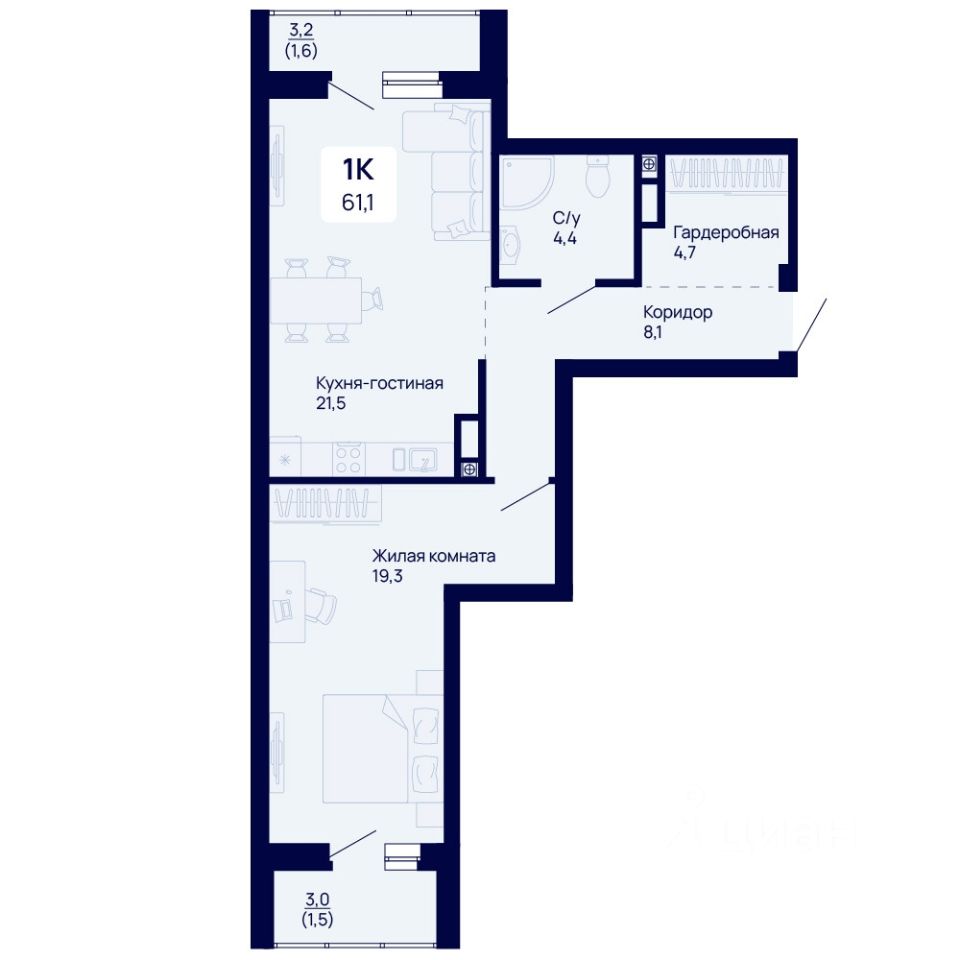 61,1 м²