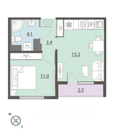 Жилая площадь 11 м2, кухня 15.2 м2, чистовая отделка. Раздельных санузлов - нет, балконов - нет, лоджий - 1.