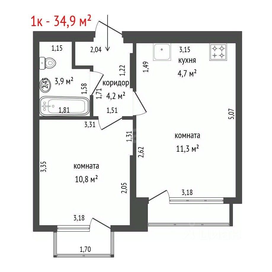 В продаже однокомнатная квартира площадью 34,9 кв. м в жилом комплексе "Брусника в Академическом" по цене строящейся квартиры.