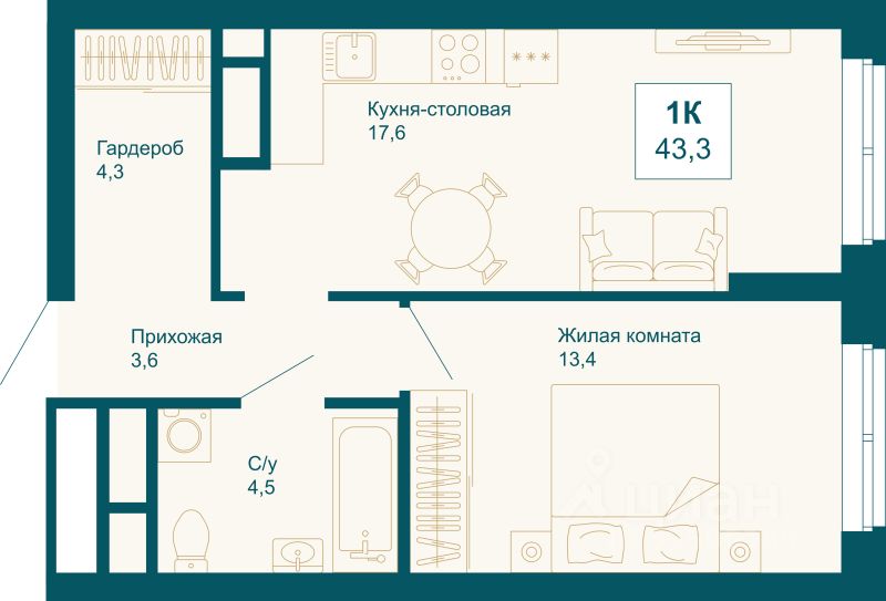 Продаётся 1-комнатная квартира в строящемся доме (Дом 2.1), срок сдачи: II-кв. 2027, общей площадью 43.3 кв.м., на 21 этаже. Расположение, транспортная доступность