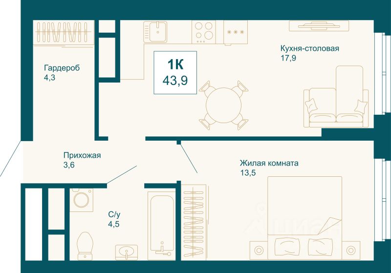 Продаётся 1-комнатная квартира в строящемся доме (Дом 2.1), срок сдачи: II-кв. 2027, общей площадью 43.9 кв.м., на 21 этаже. Расположение, транспортная доступность