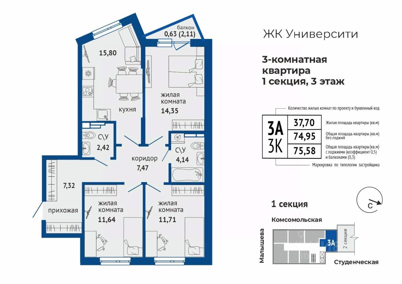 Продаётся 3-комнатная квартира в строящемся доме (Дом 1), срок сдачи: I-кв. 2028, общей площадью 75.58 кв.м., на 3 этаже. Новый жилой комплекс "Университи" от застройщика "Правобережный" расположен по адресу: г. Екатеринбург, Студенческая улица.
