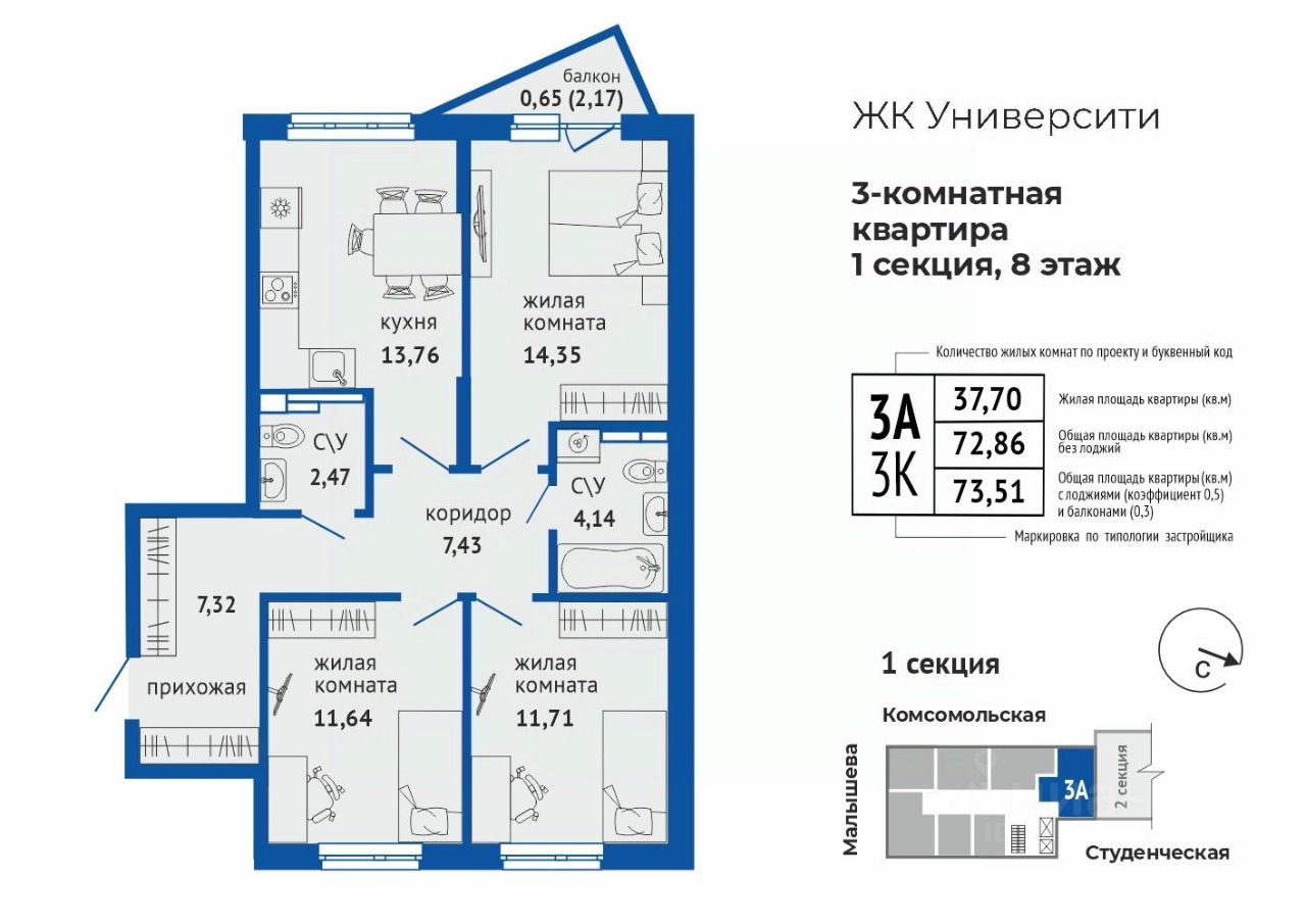 Продаётся 3-комнатная квартира в строящемся доме (Дом 1), срок сдачи: I-кв. 2028, общей площадью 73.51 кв.м., на 8 этаже. Новый жилой комплекс "Университи" от застройщика "Правобережный" расположен по адресу: г. Екатеринбург, Студенческая улица.
