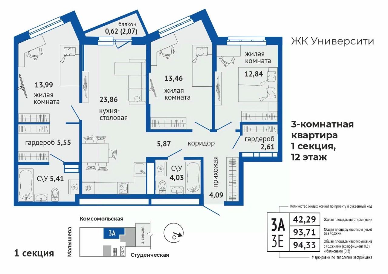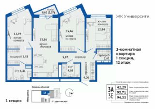 Продаётся 3-комнатная квартира в строящемся доме (Дом 1), срок сдачи: I-кв. 2028, общей площадью 94.33 кв.м., на 12 этаже. Новый жилой комплекс "Университи" от застройщика "Правобережный" расположен по адресу: г. Екатеринбург, Студенческая улица.